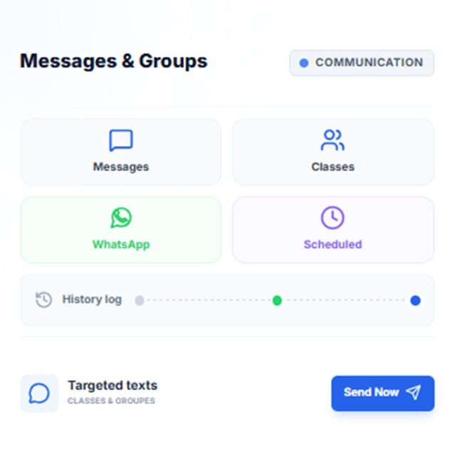 Send targeted messages by class, level, or group using built-in messaging and WhatsApp.